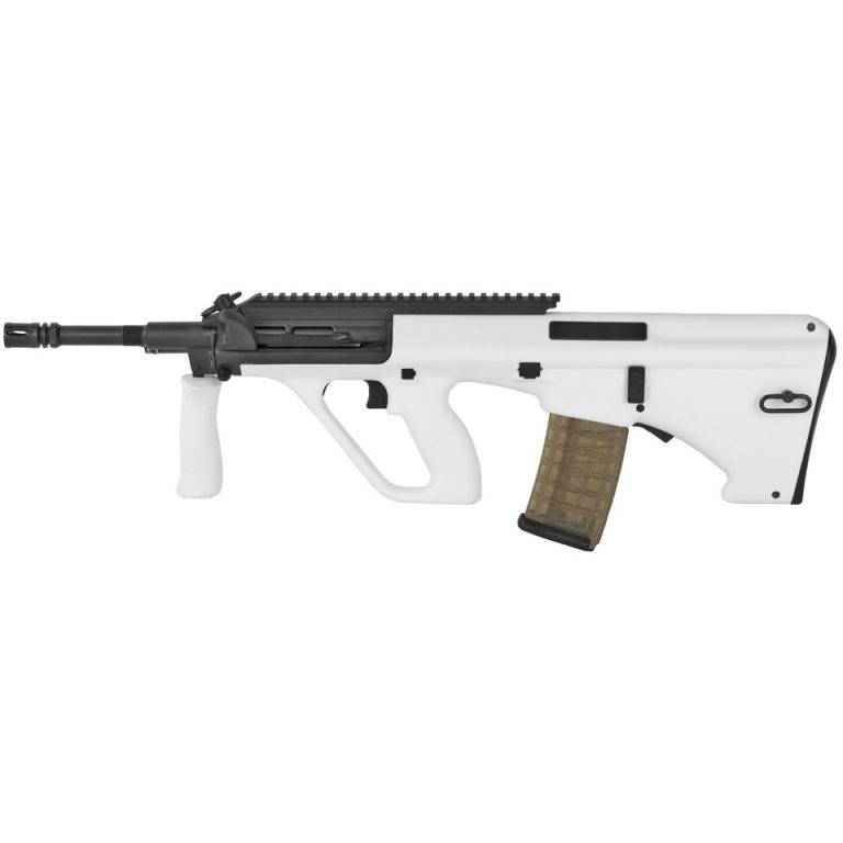 The AUG A3 M1 stock, cocking piece and forward grip are made of highly durable synthetic and are available in Black, Green, Mud and White colors. This is the NON NATO version, so this does not take standard AR-15 Magazines, only the Steyr Arms Magazines.
