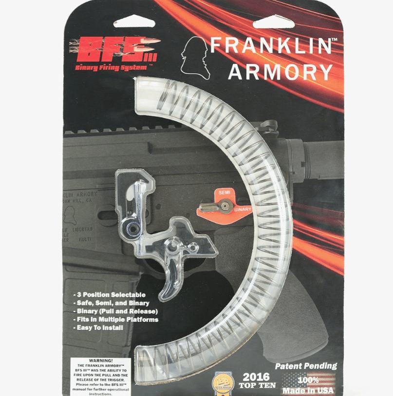 The Binary Firing System® GEN 3 (BFSIII®) is a 3-position trigger. In position 3 it fires one round on pull and one round on release, making this trigger ideal for both tactical and competition use. The BFSIII® provides greatly reduced split times between rounds, allowing for tighter groups. The Franklin Armory BFSIII AR C1 is now in stock – don’t miss out!!